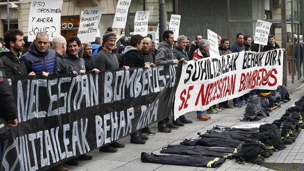 Los concentrados han permanecido en silencio tras dos pancartas en las que se leía, en castellano y en euskera, “se necesitan bomberos-as”, mientras algunos de ellos portaban carteles con diferentes reivindicaciones.