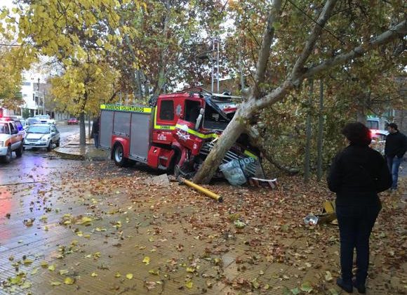 San Juan.- Un camión de Bomberos Voluntarios de Chimbas chocó contra un auto, y terminó estampado contra un árbol, en la esquina céntrica de General Paz y Aberastain.