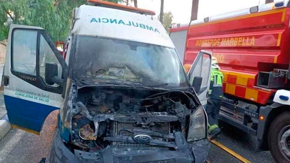 Marbella.- Una ambulancia tuvo un problema mecánico en Marbella, comenzó a arder, cuando llegaron los bomberos para sofocar el fuego en el vehículo, saltó el freno y se estrelló contra uno de los camiones de los efectivos contra el fuego que se desplazaron hasta el lugar. Fue sobre las 20.30 horas de este pasado miércoles. A esa hora, el teléfono Emergencias 112 recibió varias llamadas avisando de que una ambulancia estaba ardiéndo.
